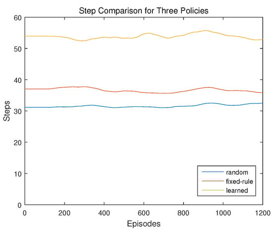 Firstly, the numbers of steps taken in each episode for using different policies are compared in Figure 10. The figure is drawn with data filtered with a window of 100 episodes. It can be seen that the number of steps are stable in the testing process, no matter which policy is used. However, it takes different numbers of steps to end an episode when different policies are used. Overall, the random policy takes the least number of steps, while the policy learned with the Sarsa based framework takes the most. Though more number of steps means more cost, it is also a reflection of higher possibility to reach the goal point and better policy to avoid the enemy UAV. Such understanding is from the following two aspects. First, the episode ending for reaching the goal point takes more steps than the episode ending before reaching the goal point for other reasons, because of the longer distance. On the other hand, it needs more steps to fly away to avoid the collision with the enemy UAV than to fly straightly towards the goal. To more accurately show the performance of different policies, more results are presented below.
