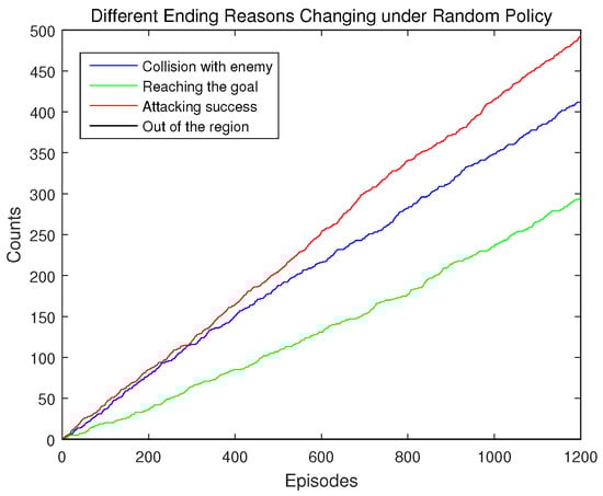 Figure 11 illustrates how the numbers of episodes ending for different reasons change as the number of the total episode increases under the random policy. From Figure 11, it can be seen that there are mainly three ending reasons for these episodes, which are collision with the enemy UAV, reaching the goal point successfully, and attacking the enemy UAV successfully. Besides, there is nearly no case for flying out of the region. The number of the episodes ending for reaching the goal point increases slowest among the three main ending reasons, while the episode number for successfully attacking of the enemy UAV increases the quickest. This indicates that it is easier to end the episode by attacking the enemy UAV. The reason for this should be that ending the episode by successfully attacking takes only an attacking action as long as the attacking action is executed at a relatively near distance from the enemy UAV. On the contrast, to reach the goal point successfully is much harder, for it needs to avoid the moving enemy UAV by taking many decision steps in an appropriate sequence.