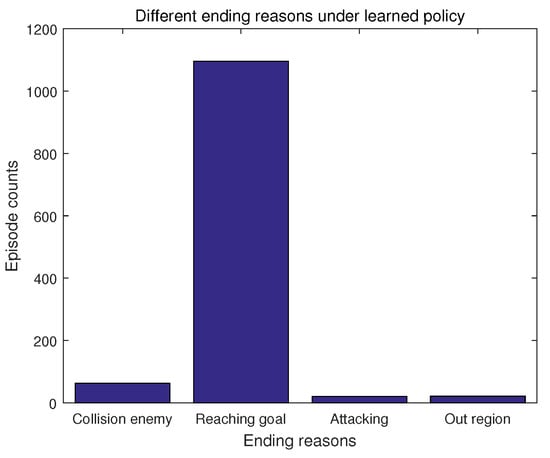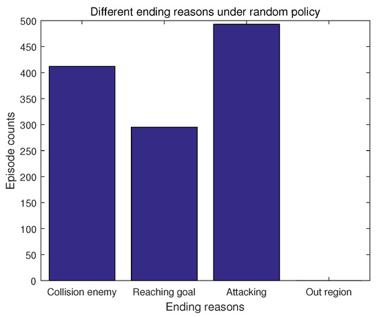 Figure 12 presents the total episode numbers of different ending reasons when the random policy is used. It can be seen more clearly that the number of episodes ending for reaching the goal point is smaller than those for the other two ending reasons (collision with the enemy UAV and attacking the enemy UAV successfully). Therefore, the random policy is unable to guide the decision making UAV to fulfill its mission very successful, and the results of this policy only reflect different challenges for achieving different ending reasons.