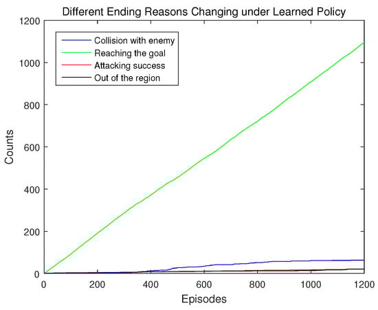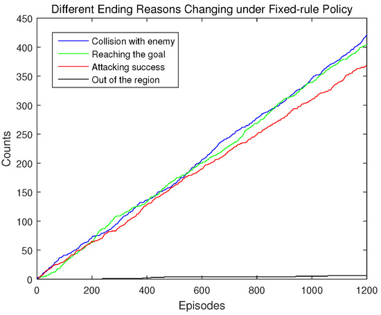 When the fixed-rule policy is used, the numbers of episodes ending with different reasons increase during the testing process, as shown in Figure 13. Still, there are three main ending reasons, which are collision with the enemy UAV, reaching the goal point successfully, and attacking the enemy UAV successfully. The number of episodes ending for attacking the enemy UAV is less than that of collision with the enemy UAV, while the number of the episodes ending for reaching the goal point successfully is nearly equal to that of collision with the enemy UAV. Compared with the random policy, these results show that the fixed-rule policy can reduce the unnecessary use of the attacking action, and can increase the use of some effective enemy avoidance actions so as to increase the probability of reaching the goal point successfully.