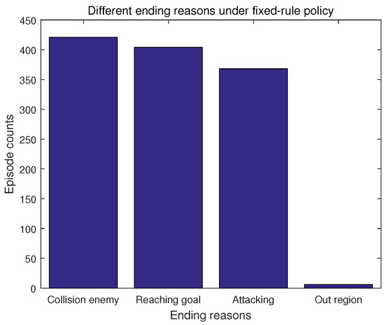 Figure 14 gives the total number of episodes for each ending reason in the fixed-rule policy experiment. Compared with that of the random policy, the fixed-rule policy can obviously reduce the number of episodes ending for attacking the enemy UAV, but is not effective in reducing the number of episodes for colliding with the enemy UAV.