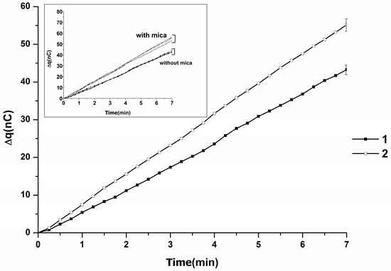 One can note slight variations between Δq(t) obtained in the absence of mica chip (see inset). The charge accumulation rate without mica was 42 to 44 nC in 7 min, the average value was (43 ± 1) nC in 7 min. In the presence of mica chip, an increase in charge accumulation rate was observed in comparison with the case without mica. An increased level of charge accumulation (53 to 57 nC) was observed, with an average value of (55 ± 2) nC in 7 min. Also, one can note an insignificant variation between ∆q(t) obtained in the presence of mica chip (see inset). Thus, in the main graph in Figure 2, averaged ∆q(t) dependencies are presented. As seen from Figure 2, an increased rate of charge accumulation is observed when a mica AFM chip is placed near the injector nozzle—as compared to the case without the chip. The accumulation of the generated charge in the measuring cell was linearly dependent on time.
