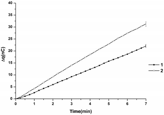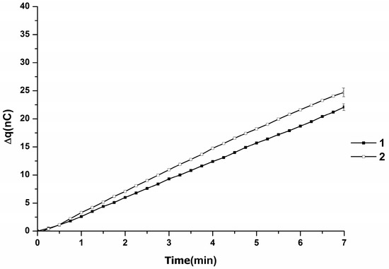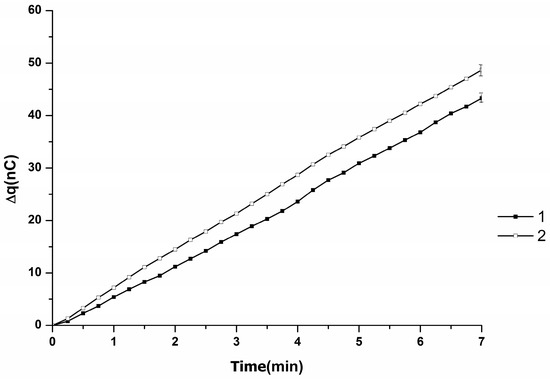 When the distance between the injector nozzle and chip was 10 mm, analogously to the case with l = 4 mm, an increased level (in comparison with the case without mica chip) of charge accumulation (48 to 50 nC) was observed. In a series of three repeated experiments, an average value of (49 ± 1) nC in 7 min was obtained (Figure 3). Figure 3 displays averaged Δq(t) dependencies obtained in this series of experiments.