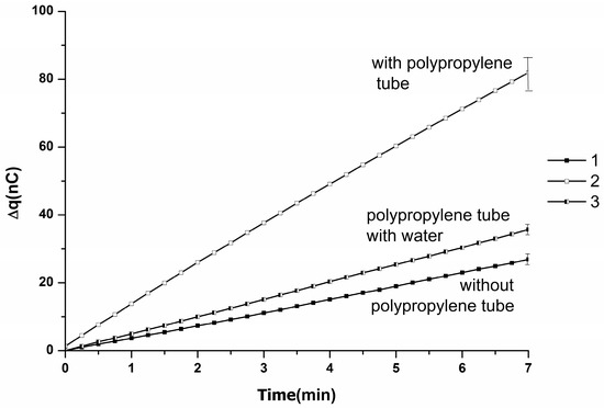When the tube was filled with 10−4 M protein solution (whose concentration is approximately equal to the protein concentration in human blood [20]), the increase in the efficiency of charge accumulation in the measuring cell was approximately of the same level, as in the case of the tube filled with pure water. Here, it is to be noted that the charge of the polypropylene tube filled with protein solution was at the same level (−6 nC).