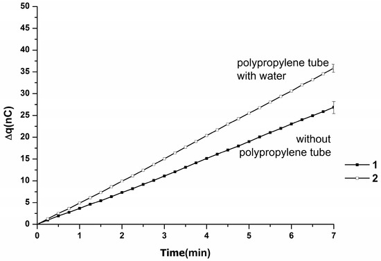 Figure 7 displays averaged time dependencies of charge accumulation in the measuring cell in the absence of the polypropylene tube, as the variation between the Δq(t) observed within the corresponding series of three experiments was insignificant. The averaged dependencies for the case when the tube was placed at a distance l = 1 cm from the injector nozzle are also presented in this figure.