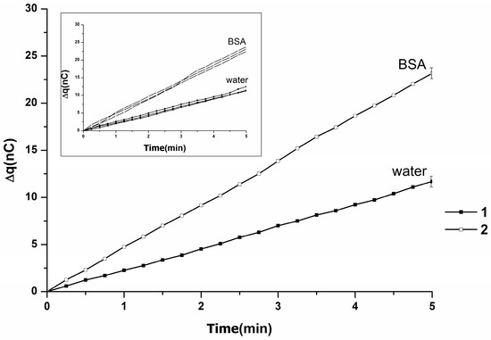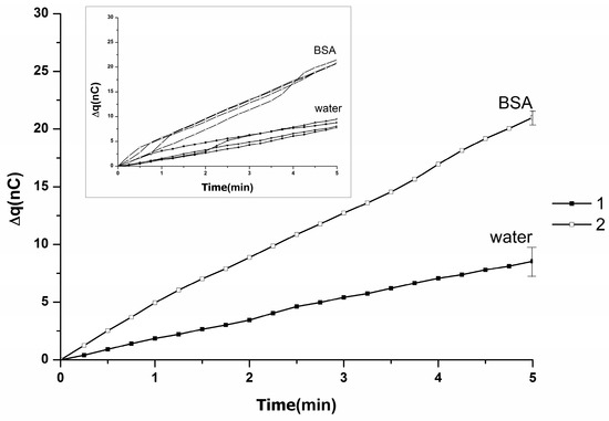 In Figure 10, the main graph presents averaged Δq(t) dependencies obtained in a series of experiments: (1) without BSA, and (2) with BSA. The Inset displays typical Δq(t) dependencies obtained in a series of experiments upon pumping of water (either with or without BSA) through the injector. As seen from the main graph in Figure 10, in the presence of BSA, an increase in the rate of generation of charge and its accumulation in the measuring cell from (12 ± 1) nC (in the absence of the protein) to (23 ± 1) nC (in the presence of the protein)—that is, by (92 ± 10)%—is observed. Thus, a stimulating influence of the presence of protein on the charge generation in water is observed, when Δq(t) dependence was linear.