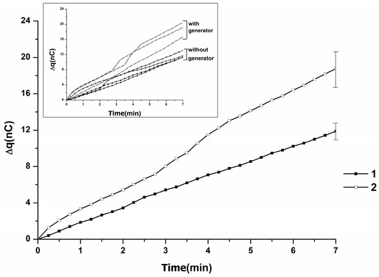 The effect of an external AC electric field on the charge generation in water. Averaged ∆q(t) dependencies obtained upon flow of water through the injector nozzle in the absence (1) and in the presence (2) of an external electric field. Main graph presents averaged Δq(t) dependencies. Inset displays typical Δq(t) dependencies obtained in experiments upon pumping of water through the injector. Experimental conditions: (1) in the absence of an external electric field (“without generator”); (2) in the presence of an external electric field (“with generator”). Experimental conditions: ∆U = −100 V voltage, 50 Hz frequency, 35 °C temperature, 15 µL/s flow rate.