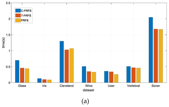 Figure 2 shows the running time of three methods. In Figure 2a, our new method is always slower than the other two methods. However, in the Hillvalley dataset, our new method performs better, which means it is more suitable for high-dimensional data than the other two methods. The reason is that our method obtains a smaller reduct, so the program ends earlier and running time is less.