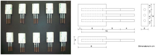 This experimental work involved the preparation of prismatic mortar test specimens measuring 6 × 8 × 2 cm3, in which 3 parallel steel rebars with a diameter of 6 mm were embedded (Figure 1). The study is a continuation of research into LFS as a partial replacement for aggregate and cement in mortars [32,33] from the viewpoint of its behavior with regard to rebar corrosion and the symptom this produces with the time.