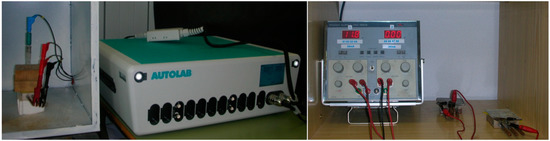Setup for carrying out electrochemical measurements using an AUTOLAB/PGSTAT302N potentiostat and setup of the accelerated corrosion process using a POWER SUPPLY FAC-662B POWER SUPPLY FAC-662B (PROMAX, Barcelona, Spain, 1998).