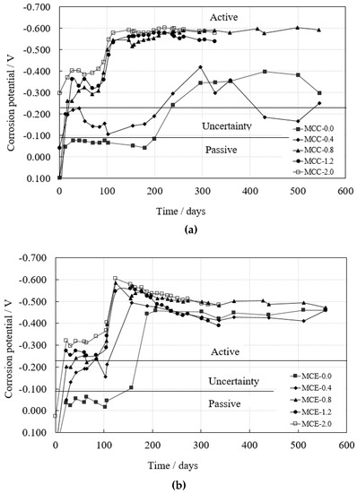 The first evaluation of rebar behavior with regard to corrosion was made by measuring their corrosion potentials, which are useful for a qualitative determination of whether the steel bars are in an active or a passive state. The data obtained were interpreted according to the ASTM C 876 standard [36], from which, taking into account the reference electrode used, it was concluded that Ecorr < −231 mV would indicate a 90% probability that corrosion exists in the active state, a potential in the region −231 mV < Ecorr < −91 mV would indicate uncertainty, and Ecorr > −91 mV would indicate a probability of 10% that corrosion exists in the active state.