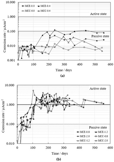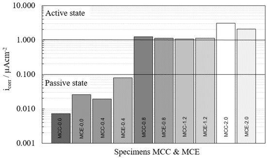 According to different research [37], icorr < 0.1 µA/cm2 indicates a passive state, 0.1 µA/cm2 < icorr < 0.5 µA/cm2 is equivalent to a low level of corrosion, 0.5 µA/cm2 < icorr < 1 µA/cm2 to a high level of corrosion, and icorr > 1 µA/cm2 to a very high level of corrosion.