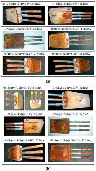 Figure 6 and Figure 7 show the symptoms produced by the corrosion of the steel bars subjected to an accelerated corrosion process by an impressed anodic current for chloride ion percentages of 1.2% and 2.0% by weight of cement. Each image shows the number of days that had elapsed since the start of the process of natural corrosion, the number of days subjected to accelerated corrosion, and the potential and the intensity of the current passed through the rebar.