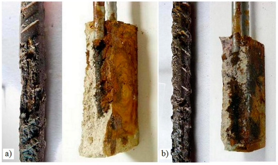Corrosion products in the test specimens without (a) and with LFS (b), with 2% chloride ions by weight of cement.