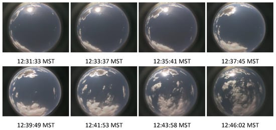 Figure 3 displays a sequence of eight pictures taken by the SkyImager at the NREL site, one every two minutes starting (upper left) at 12:31pm MST. At that time the sun is not obscured, but cumulus clouds are moving in from the left. At 12:35 the cloud begins to enter the solar disk and by 12:37 the sun is completely occluded. This continues until 12:44 when the cloud has moved past the sun and the DNI recovers. This ramp event is seen in the DNI oscillations that occur around the noon hour in Figure 2. While this example considers a single ramp event, it strongly suggests that the correlation between measured GHI and the presence of clouds obscuring the sun in the SkyImager pictures could be learned by AI models.