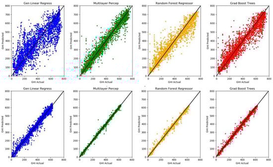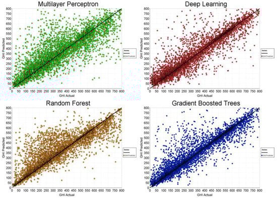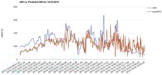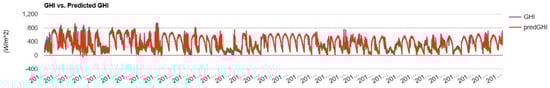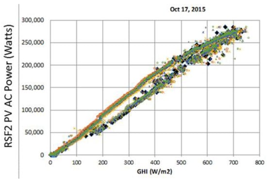 Figure 4 shows the relationship between GHI (Watts/m2) and PV power (Watts) from the RSF2 PV arrays located at NREL. The relationship is almost linear with a slight hysteresis effect that reflects the differences in morning versus afternoon irradiance. The task of predicting PV power output over multiple temporal and spatial scales, and from a variety of different equipment is a challenging one [,,].