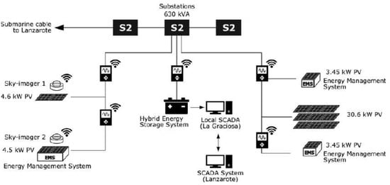 La Graciosa is the smallest island in the Canary Archipelago with a surface area of 29 km2. It is in a marine nature reserve north of Lanzarote and home to about 700 people in the island capital of Caleta de Sebo. Average global irradiation is 5.157 kWh/ kW·day (1883 kWh/kW·yr) while the average monthly high temperature is 20.8 °C. Located a few kilometers away from the African coast, its proximity to the Sahara Desert gives to La Graciosa particularly stable atmospheric characteristics due to a quasi-permanent subsidence thermal inversion. Constant north trade winds, along with the high content of aerosols and dust in the atmosphere, have a large influence over the cloud dynamics and therefore, the irradiance in the region. As shown in Figure 9, the La Graciosa grid is supplied by three 20/0.4 kV transformers (600, 400, and 400 kVA) and tied by a 20 kV seabed cable to Lanzarote. The island has two PV generation plants (5 kW and 30 kW), but recently La Graciosa PV capacity was increased, enhancing the attractiveness of a smart grid energy management system.
