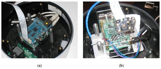 (a) Original configuration Raspberry Pi 2/Odroid C1, (b) Current hardware with a single Pi 3 Model B.