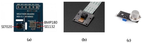 (a) Hardkernel’s WeatherBoard, (b) PiNoIR camera, and (c) MQ 131 Ozone Sensor.