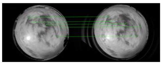 In the GRACIOSA project, a pure geometric method based on the relative position of the sky-imagers and the clouds was implemented. First, the algorithm looks for the same cloud feature in the images coming from the two sky-imagers. This task can be extremely difficult due to the chaotic nature of clouds and slight changes in image properties such as luminosity. But fortunately, a Scale-Invariant Feature Transform (SIFT) algorithm [], can handle this situation. This algorithm performs excellently, identifying features in a constantly changing shape (as clouds), since it considers possible changes in scale and orientation. SIFT is applied to pairs of simultaneous images from both cameras (Figure 16). Once the features from both images have been paired up, the best matches are selected to continue the calculations. Valid features are then transposed from the image (pixels) to real space (azimuth and zenith). With real space coordinates defined and the projection matrix of the lenses known, geometric computation is used to obtain the length of the vectors containing each feature and the geographical position of each camera in real space, from which the height of the evaluated feature can be derived.