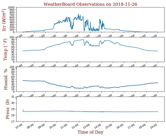Microgrids lack the stabilizing effects present in a large urban macrogrid that itself is joined to an interconnect; these issues are critical when a microgrid is operated in islanded mode. The Energy Management Systems (EMS) that balance PV output, load, and battery storage require accurate intra-hour irradiance forecasts to solve the control problem by shedding non-critical load when power generated is predicted to drop significantly below the load. An increasingly important problem for utilities is optimal scheduling and dispatch of a microgrid [,,,], both when connected to the macrogrid and when operated as an island. This task is divided into Day-Ahead Scheduling, which finds optimal schedules for the next operating day and focuses on energy markets, and Intra-day Dispatching and Scheduling in which schedules are continuously updated during the current day. Both cases follow these steps: (1) forecast day-ahead load, (2) forecast day-ahead renewable power (solar, wind), (3) Micro-Grid Management System (MGMS) optimizes the day-ahead plan, produces schedules for flows within the microgrid and to the PCC, (4) MGMS transmits schedules to utility control center.