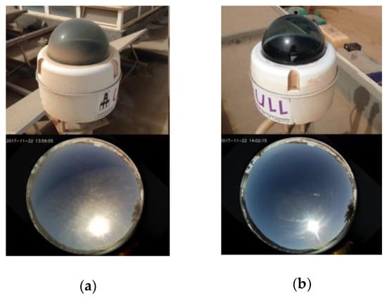 (a) SkyImager/image with dust on enclosure, (b) after cleaning it.