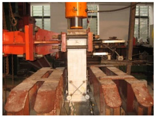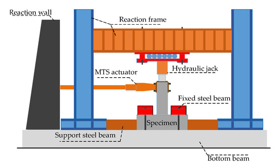 A schematic and a photo of the test setup are shown in Figure 2 and Figure 3, respectively. In order to prevent sliding of the specimen during the test, the specimen was fixed on strong ground by using two support steel beams and two fixed steel beams, which have a certain rigidity as a constraint of the frame column. Each specimen was tested under a constant axial gravity load during the experiment before applying a lateral force P to simulate seismic loading. The lateral force P was applied by an electro-hydraulic servo actuator placed at the top of the column. Linear variable displacement transducers (LVDTs) were adopted to monitor the horizontal displacement of the columns.