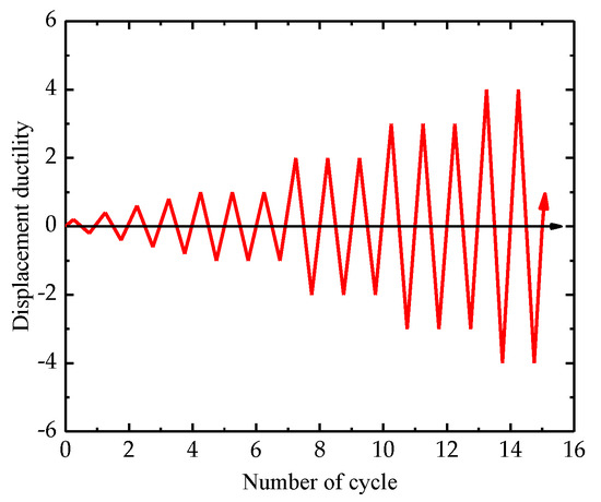 The monotonic loading was applied on the specimen SRC-1, and the remaining specimens were subjected to one cycle of loading with displacement ductility equal to 0.2, 0.4, 0.6, and 0.8, and followed by three successive cycles of loading with the displacement ductility equivalent to 1.0, 2.0, 3.0, …. until the horizontal load dropped to 80% of the peak load of the specimens or the load could not be continued because damage was apparent and the loading was stopped [55]. The specific cyclic loading history is shown in Figure 4.