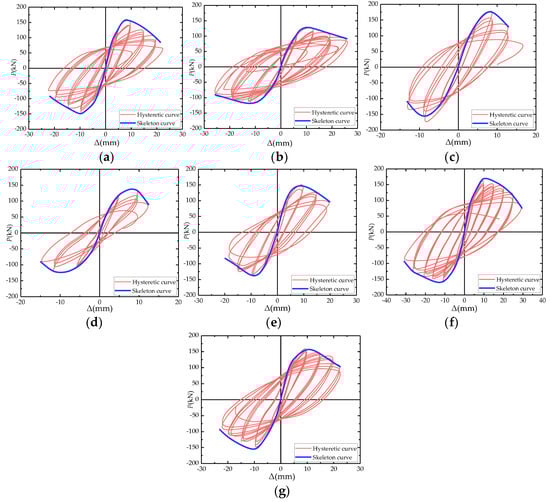 Hysteresis curves and skeleton curve of specimens. (a) SRC-2; (b) SRC-3; (c) SRC-4; (d) SRC-5; (e) SRC-6; (f) SRC-7; (g) SRC-8.