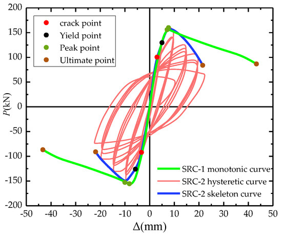 The loading-displacement (P−) hysteresis curves of the members under cyclic loading are the basis of the hysteretic performance for the structural members. Based on the test results, the loading– displacement hysteretic curves and skeleton curves for the SRC frame columns, which can be obtained by connecting the peak points of the hysteretic loops, are shown in Figure 5. It can be seen that: