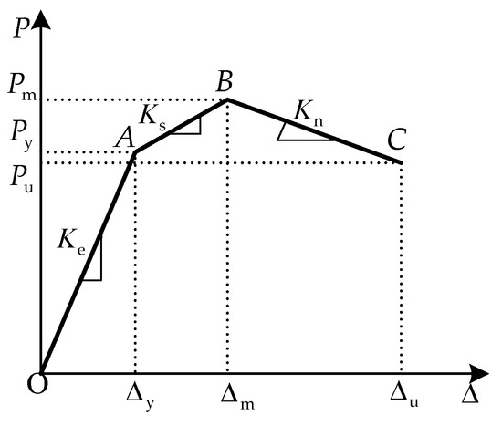 At present, most skeleton curves are obtained by connecting the peak points of the member hysteresis curves. In fact, the members would produce a certain degree of damage under the process of cyclic loading. With the increase of the number of cycles and displacement amplitude, the damage accumulation of the members continuously increases. Therefore, it is difficult to determine the skeleton curve by the existing method and truly reflect the degradation of the mechanical properties of the members under an earthquake. A monotonic load–displacement curve can be used as a skeleton curve to better reflect the degradation of the structural members performance caused by cyclic loading and describe the hysteresis characteristics of structural members under an earthquake [56,57]. Therefore, in this paper, the load-displacement curve under monotonic loading of members was used as the skeleton curve as shown in Figure 6. Based on the results of this test, it can be seen that the SRC frame column slightly cracks before yielding. In addition, the lateral deformation of the member is smaller and the slope of the loading curve changes little. At the same time, the initial stiffness of the skeleton curve of the members is relatively large, there is no obvious inflection point when the specimen yields. The strength after yielding is still greatly improved. Therefore, at the initial stage of loading, the skeleton curves are basically coincident and the peak load is close. After the peak load, although the strength of the member decreases, the slope of the falling part is not large, which indicate that the strength degradation of the members is relatively slow. However, the damage accumulation of the members continually increases under repeated loading, which induces the degradation of the bearing capacity and stiffness, and the falling part of the skeleton curve becomes steeper. The ultimate deformation is reduced. Considering that the main purpose of the elastoplastic seismic response analysis is to study the mechanical behavior of the member after entering the inelastic stage, in order to simplify the calculation, in this paper, the skeleton curve before the yield of the SRC frame column can be simplified by a connection from the coordinate origin to the yield point. Therefore, the skeleton curve of the SRC frame column can be simplified to an ideal trilinear skeleton curve model that is shown in Figure 7. The segment OA is the elastic stage, and the segment AB that has a significant strength hardening section in the skeleton curve after the specimen yielded, is the elastic-plastic stage. In addition, the segment BC is the plastic descent segment.