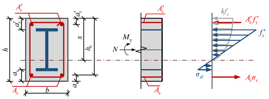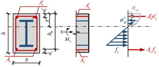 For large eccentric compression, the yield point of the SRC columns corresponds to the steel yielding at the tension flange. According to the test results, when the longitudinal tension rebars yield, the steel tension flange is also close to yielding. The maximum strain of concrete adopted in this paper is more than 0.002 that is larger than the yield strain of the longitudinal rebars and the steel flange. Therefore, it can be assumed that the concrete stress in the compression zone is a quadratic standard parabolic distribution, and the calculation diagram of the large eccentric compression SRC column and the stress–strain distribution of the section are shown in Figure 8.