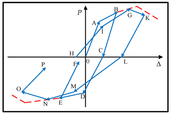 - When the horizontal load reaches the yield load, the hysteresis loop is simplified into four parts, namely, the elastic section HI (LM), the strengthening section IG (MN), the softening section GK (NO), and the unloading section KL (OP) in Figure 11.