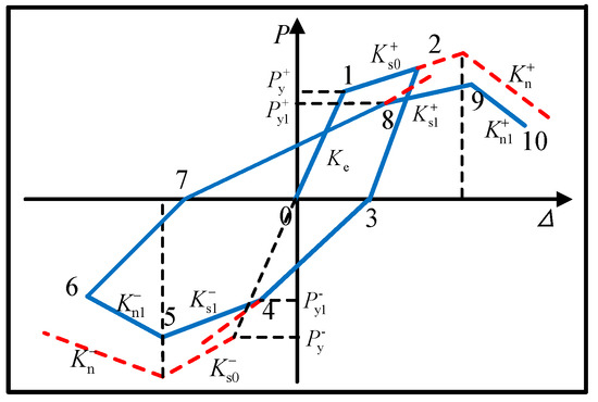 Figure 12 shows the degradation rule of member yield load, hardening stiffness, and softening stiffness. The member is loaded from point 0 to point 2 along the loading path 0–1–2. The initial loading stiffness is , the hardening stiffness is , the softening stiffness is . Then along point 2 unloaded to point 3, the unloading path is 2–3. A half cycle is completed from point 0 to point 3 according to Equation (18) to calculate a damage value. Then the degradation index is calculated through Equation (22), and the respectively corresponding strength and stiffness values are calculated by Equation (24), Equation (25), and Equation (26). In the reverse loading, the yield load of the members decreases from to , the slope of the hardening stiffness decreases from to , and the slope of the negative stiffness decreases from to . From point 6 unloads to point 7, the damage value is calculated by Equation (18) again. Next the half-cycle damage value increment is calculated, and then the degradation index is recalculated by Equation (22). When the member is reloaded along the load path 7–8–9, the yield load of the structure reduces from to , the hardening stiffness decreases from to , and the softening stiffness decreases from to .