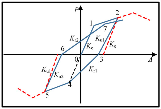 As shown in Figure 13, the loading starts from point 0 to the reverse loading point 3 along the loading path 0-1-2-3. At this time according to Equation (18) to calculate a damage value, and then according to Equation (22) to calculate the degradation index . During the reverse loading, according to the Equation (28), the reloading stiffness of the member is changed from to , and then the reverse loading starts from point 3 to the reverse unloading point 6 along the loading path 3-4-5-6. At this time according to Equation (18) to calculate a damage value. At the same time, the damage increment of the half cycle is calculated, and then the degradation index is recalculated by Equation (22). During reloading process, the reloading stiffness of the member is changed from to .