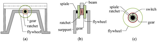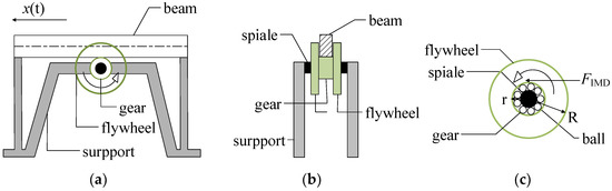 where represents the moment of inertia of the IMD and M is the flywheel mass of the IMD; is the angular acceleration of the IMD. Equation (2) is considered to be established ideally, ignoring the gear friction. The translational motion of the beam drives the gear to rotate. It can be obtained that