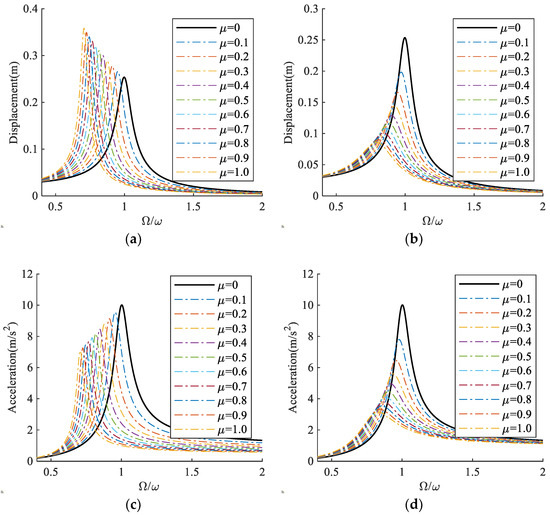 Steady-state peak responses for a SDOF system with IMD and CID under sinusoidal excitation. (a) Displacement of IMD system; (b) Displacement of CID system; (c) Acceleration of IMD system; (d) Acceleration of CID system.