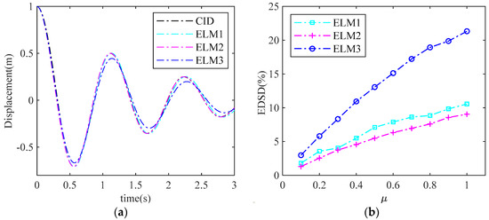 Free vibration is a motion that can reflect the inherent characteristics of the structure, including natural frequency and damping. Figure 7a shows the displacement response of the CID system and the ELS with different ELMs; it seems that ELM2 based on period and energy is the most accurate solution followed by ELM2, and ELM3 has the maximum error, as seen in Figure 7b.