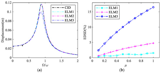 Figure 8 shows the comparison of the steady-state peak response of displacement between the CID system and the ELS with different ELMs under harmonic excitations sin(Ωt). As shown in Figure 8b, ELM1 is the most closed approach to the CID system followed by ELM2, and ELM3 still seems to be the method with the biggest error.