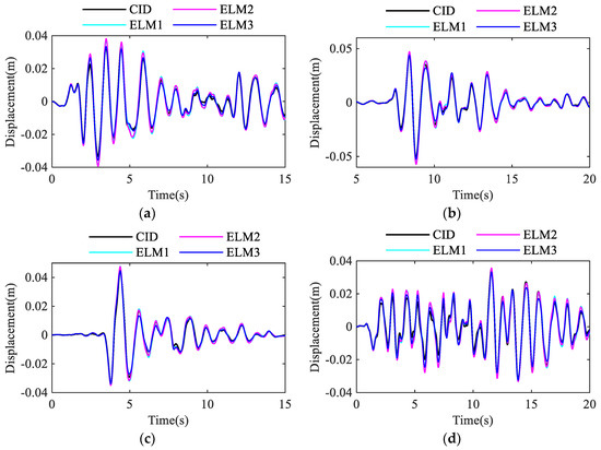 Displacement response of the CID system and equivalent linear system (ELS) to seismic excitations when is 0.5. (a) Elcentro wave; (b) Kobe wave; (c) Northridge wave; (d) Artifical wave.