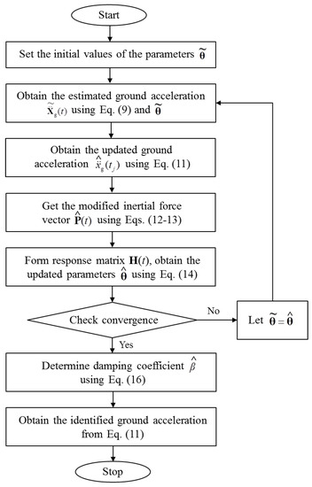 When the iteration procedure is complete, the ground acceleration can be directly found from Equation (11). Moreover, since both ki and qi are identified, the damping coefficient β can be determined as follows: