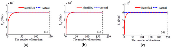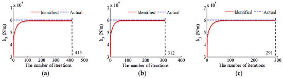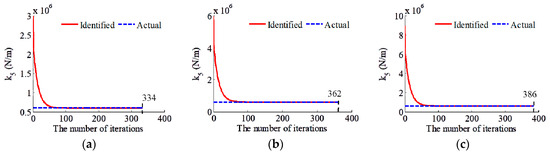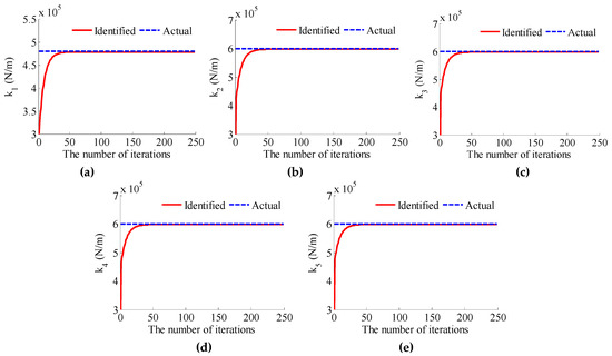 To further show the convergence process during the iteration, the identified stiffness in the case of 10% noise is given in Figure 4 as an example. Obviously, although the iteration is conducted for 248 times due to the relatively stringent tolerance defined before (i.e., ε = 1%), the identified stiffness parameters are stably converged to actual ones, the number of iterations being approximately 50. On the basis of the identified stiffness and the element-wise coefficient qi in matrix Q, the damping coefficient β can be calculated according to Equation (16) as 7.556 × 10−5, 6.737 × 10−5, and 4.103 × 10−5 for the cases of noise-free, 5% noise, and 10% noise, respectively. Since the value of β is extremely small and difficult to assess, these identified results for β, to some extent, are acceptable. Since only the standard LSE technique and the input modification process are involved, the computational time for the proposed approach is very short. In this example, only 10 seconds are required for the identification.
