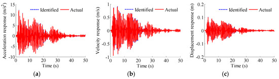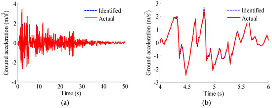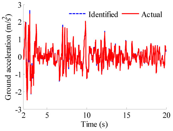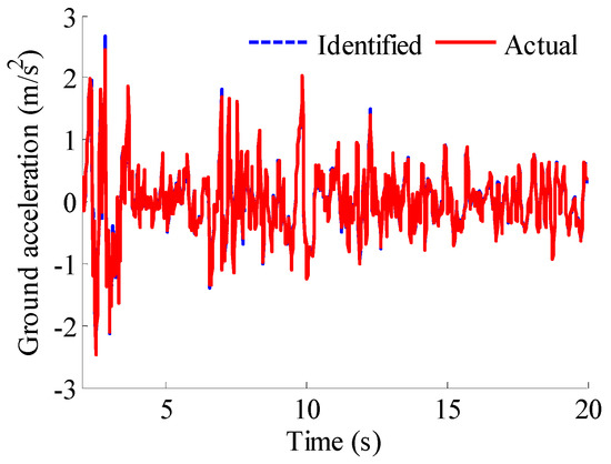 Similarly, the unknown ground acceleration can be also identified. The comparison results for the case of 15 times initial values are plotted in Figure 10. It is clear that satisfactory identification results can be obtained.