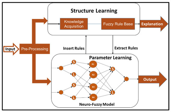 HyFIS was proposed by Kim and Kasabov [30], and it is a combination of fuzzy logic with neural networks. As Figure 1 presents, the learning process of this method is based on two phases. The first phase is the structure learning, where the method uses the knowledge acquisition module to find and create the rules. The second phase membership functions will be tuned to achieve a desired level of performance, which is the parameter learning phase.