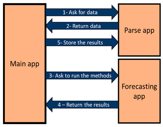 The main app is the central component of the application which connects the other two components. All the communications between the user and the application are a part of the responsibilities of the main app. Once the user chooses a date to start a forecasting process, the main app makes a connection to the parse app and asks for the needed data from the chosen date to run the forecasting algorithms. After receiving the data, the main app sends this data to the forecasting app. The forecasting app runs the forecasting methods by the received data from the main app and returns the results of the forecasting. The main app shows the results to the user and sends them to the parse app to be stored. Figure 4 presents the connections between the components of the application.