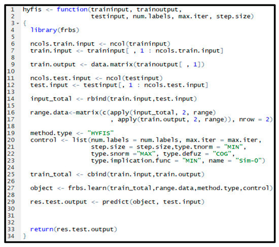 As it is visible in Figure 5, the hyfiz function in R receives three data sets as well as the needed variables to configure the method that the user can insert during the process of the forecasting. The traininput and trainoutput are used as the training data, and the testinput is meant to be used as the test data. Figure 6 presents the sequence of running the HyFIS method in R language.