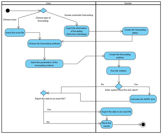 The main app is the central component of the application. The communications between the user and the application are included in this part as well as the communications between two other components of the application and the controller classes. Figure 7 presents the activity diagram of the application where the sequence of the forecasting process is presented.