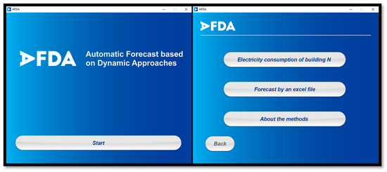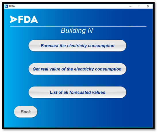 The first bottom of the menu opens the menu of the building N, the second one starts the process of forecasting by an excel file, and the third bottom opens a menu where the user has a brief explanation about the forecasting methods.