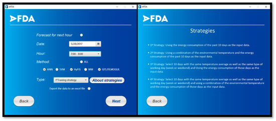 In case the user selects the first bottom, the process of the forecasting the electricity consumption of the building N will start. It opens a page where the user should choose a date, an hour, the training strategy, and at least one forecasting method. This page includes a bottom that opens an explanation of the strategies. Figure 10 presents these two pages.