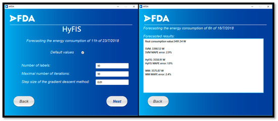 The presented case studies using this application show that the proposed approaches in this work can forecast the hour-ahead energy consumption with acceptable performance. The SVM with the third proposed data preparation strategy presents an error of 4.35% which is a trustable performance compared to the other methods and previous work. Moreover, when using additional information for training, in this case, the temperature, as input for consumption forecasting, it is visible that both the HyFIS and WM can improve their results and reach better results than the SVM (in specific, using the 4th data strategy). Hence, the application can support users’ decisions on the best method, parameterization, and data treatment that should be used depending on the available data.